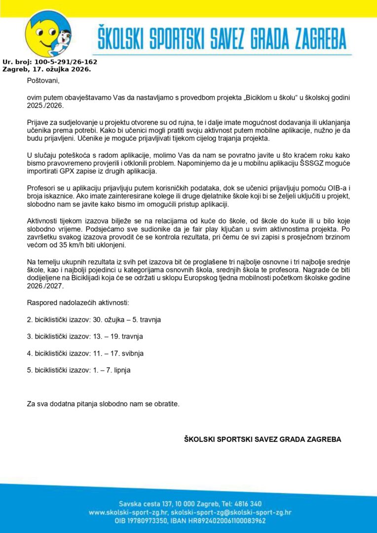 U privitku nalaze se detaljne informacije o nastavku provedbe projekta „Biciklom u školu“ za školsku godinu 2025./2026. U dokumentu možete pronaći upute za sudjelovanje te raspored nadolazećih aktivnosti.