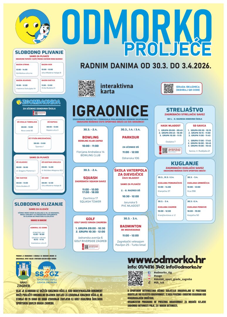 Školski sportski savez Grada Zagreba će za vrijeme proljetnog odmora učenika organizirati program Odmorko proljeće. Program će se provoditi od 30. ožujka do 3. travnja 2026. godine radnim danima uz stručni i pedagoški nadzor.